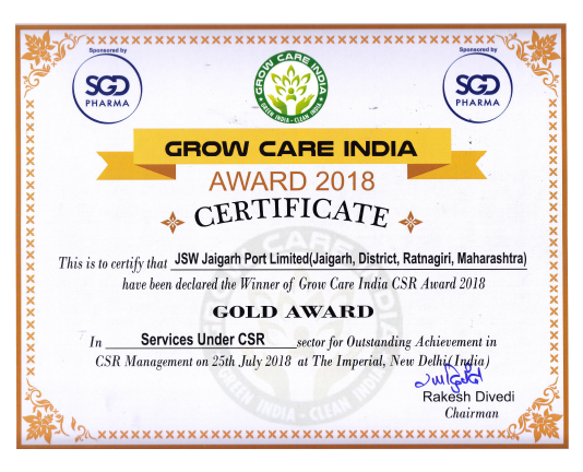 On 25th July, 2018, JSW Jaigarh Port Ltd. received the Grow Care India Award in the Gold category. The award recognises the company’s outstanding performance in their CSR management.
